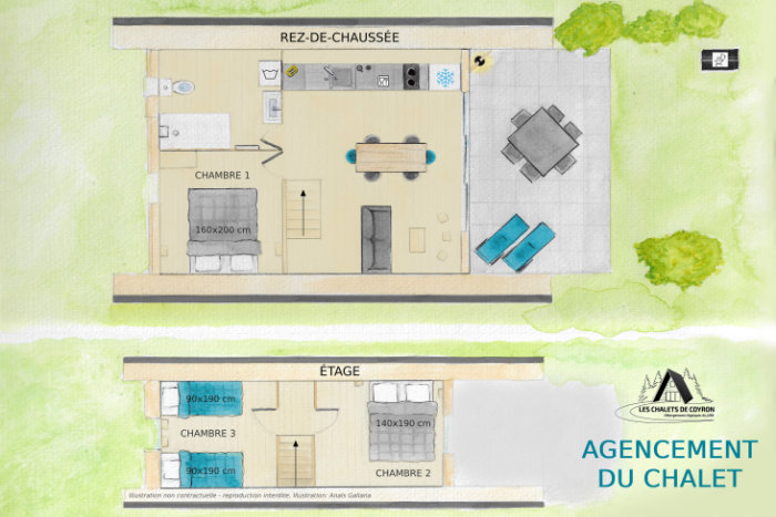 Niché au cœur du paisible village de Coyron, ce chalet atypique de 60m2 au sol vous offre une expérience unique, composé :