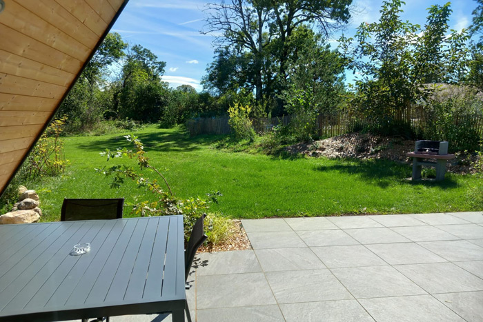 - Une grande terrasse couverte avec son mobilier de jardin et râtelier à vélos,